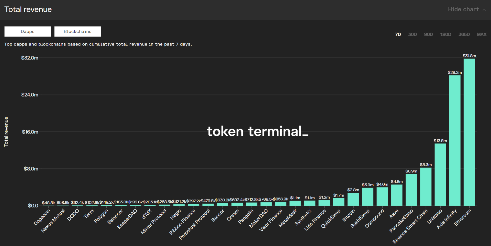但最有趣的还应该是青年,他们符合潮流,切实的贴近了DeFi风口,顺势起飞。同时也具有从中年处遗传而来的一贯链上分析的可玩性。适逢前段时间Perpetual Protocol和Axie的链上数据爆火引发的代币暴涨也让Dune和Token Terminal各自大出了一波风头。
