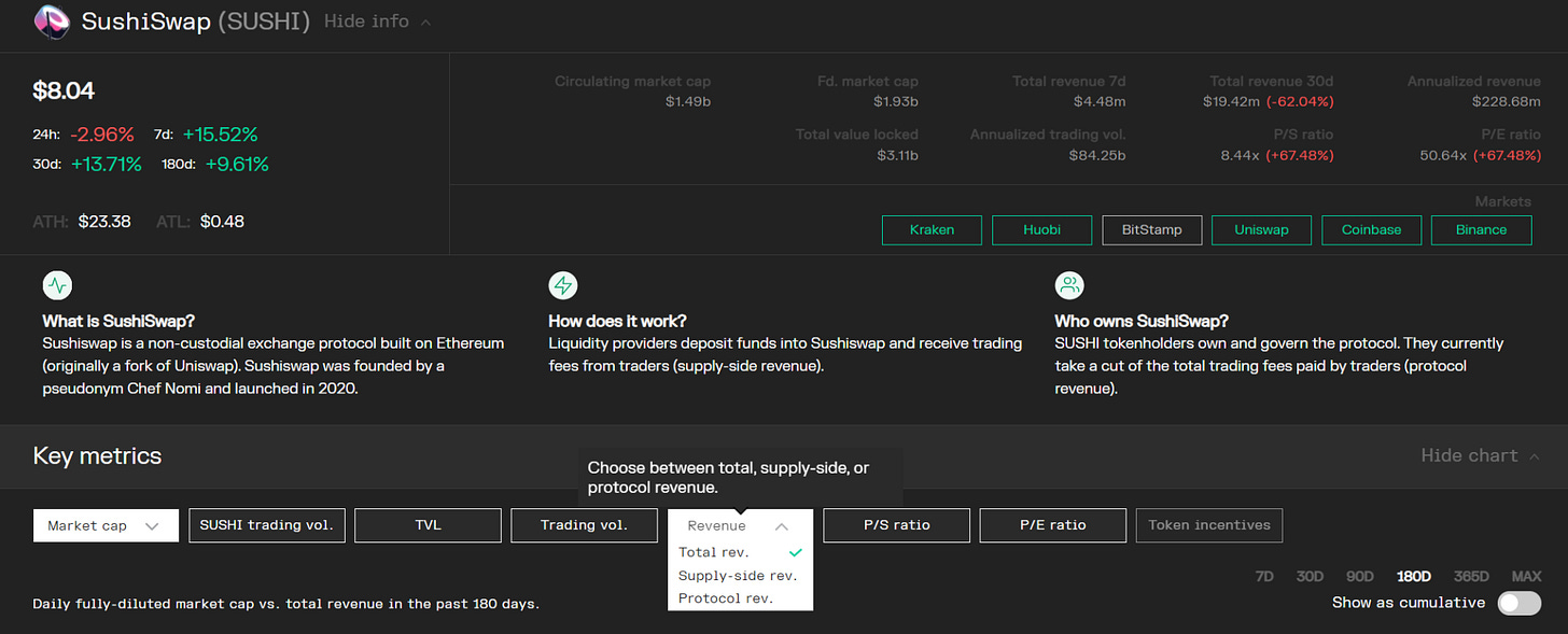 然后其中的指标就比较好解释了,同时因为不同协议的设计不同,导致有些指标并不能完全通用。比如Uniswap没有给token持有者分配收益,而SushiSwap则给token持有者发放收益,这就导致了前者没有市盈率P/E指标,而后者有。这些情况就可以在研究过程中具体问题具体分析~